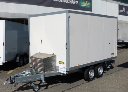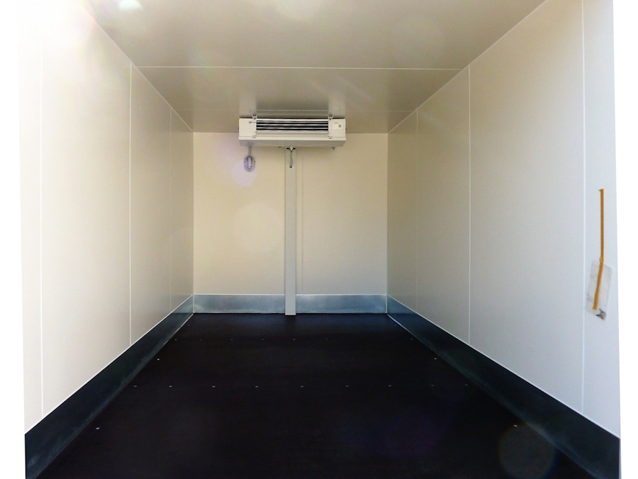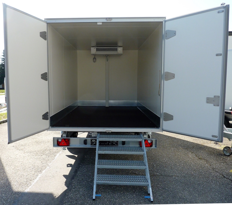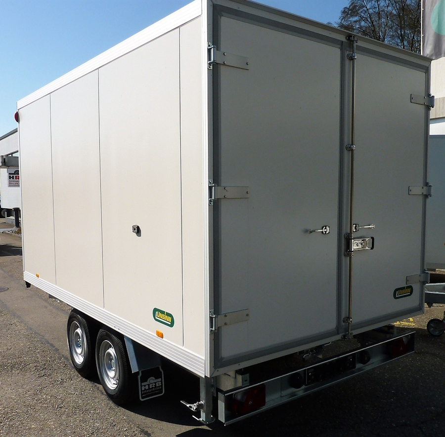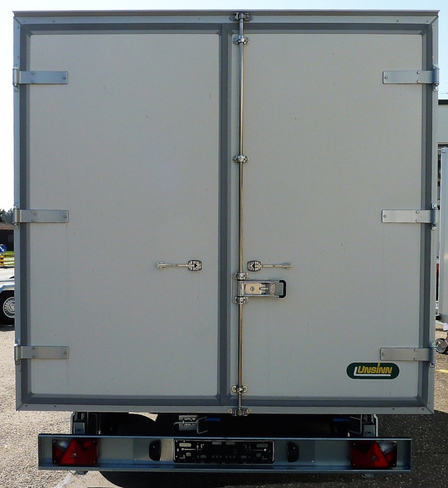 | Aufbau | Robuste und feuerverzinkte Iso 45mm Thermo-Sandwich Stahlpaneele, Aussen- und Innen, Farbe in Weiss Doppenflügeltüren mit je 3 Scharnieren, Alu-Heckrahmen mit Drehstangenverschluss, rechter Türflügel abschliessbar, Türflügel jeweils ca. 270° umschlagbar, mit Türrückhalter. |