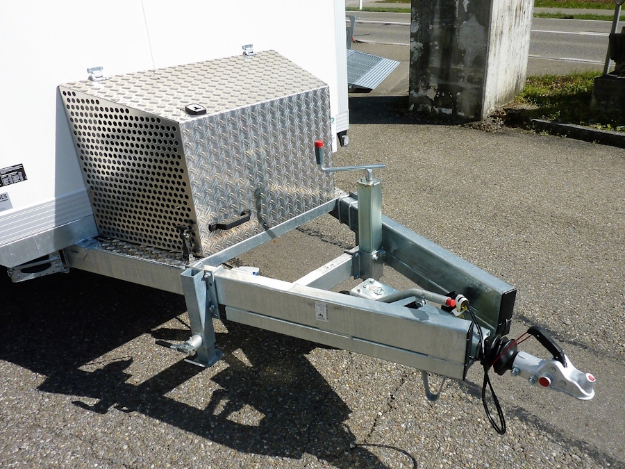 | Fahrgestell | Verwindungssteifes, massives und durchgehendes 4-kant Rohrrahmen Fahrwerk, aus geschweisstem Stahlrahmenprofil, komplett im Tauchbad feuerverzinkt |